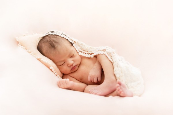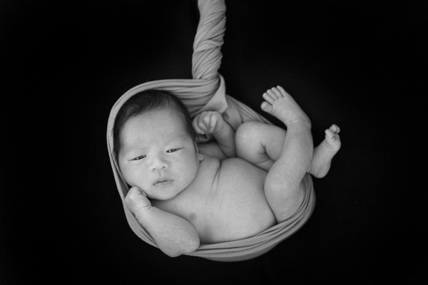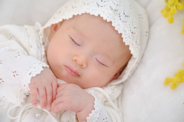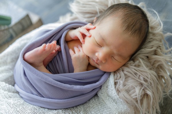 誕生から日が浅いほうが眠っている時間も多く、おくるみに包まれるのも上手です。